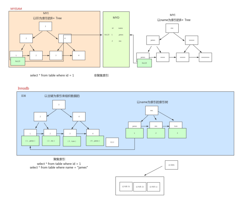 画外音:注意,不是存储行记录头指针,MyISAM的索引叶子节点存储记录指针。