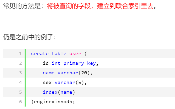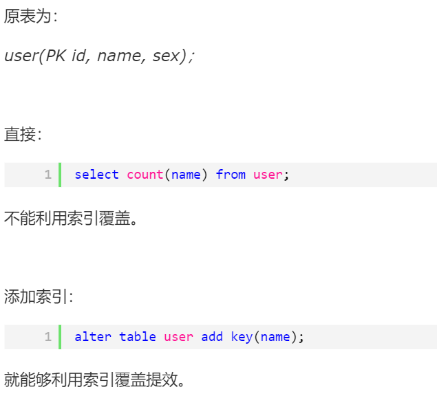 - 如果不是基于主键索引的,使用的是普通索引的,那么就要使用索引覆盖:select id from user where name=‘xxx’ limit 10000, 10 依据普通索引的特性,先查出id,然后通过id在去查询数据。